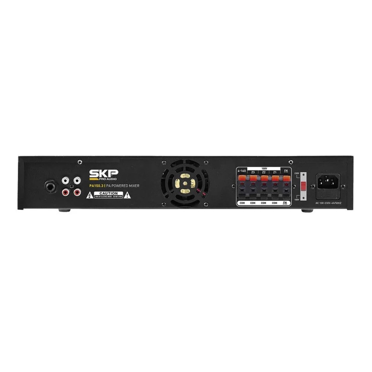 El PA 150.3 BT de SKP es un amplificador profesional diseñador especialmente para instalaciones, este resistente y compacto amplificador tiene la capacidad de amplificar 3 zonas independientes sin necesidad de utilizar otro amplificador, se utiliza principalmente en centros comerciales, auditorios, hospitales, entre otros, para música ambiental o voceo. Entrega 150w RMS, posee entrada USB para música MP3 y conexión vía bluetooth para reproducir la música que quieras desde un dispositivo móvil o Tablet. Además, posee una protección inteligente de cortocircuito y sobrecarga.