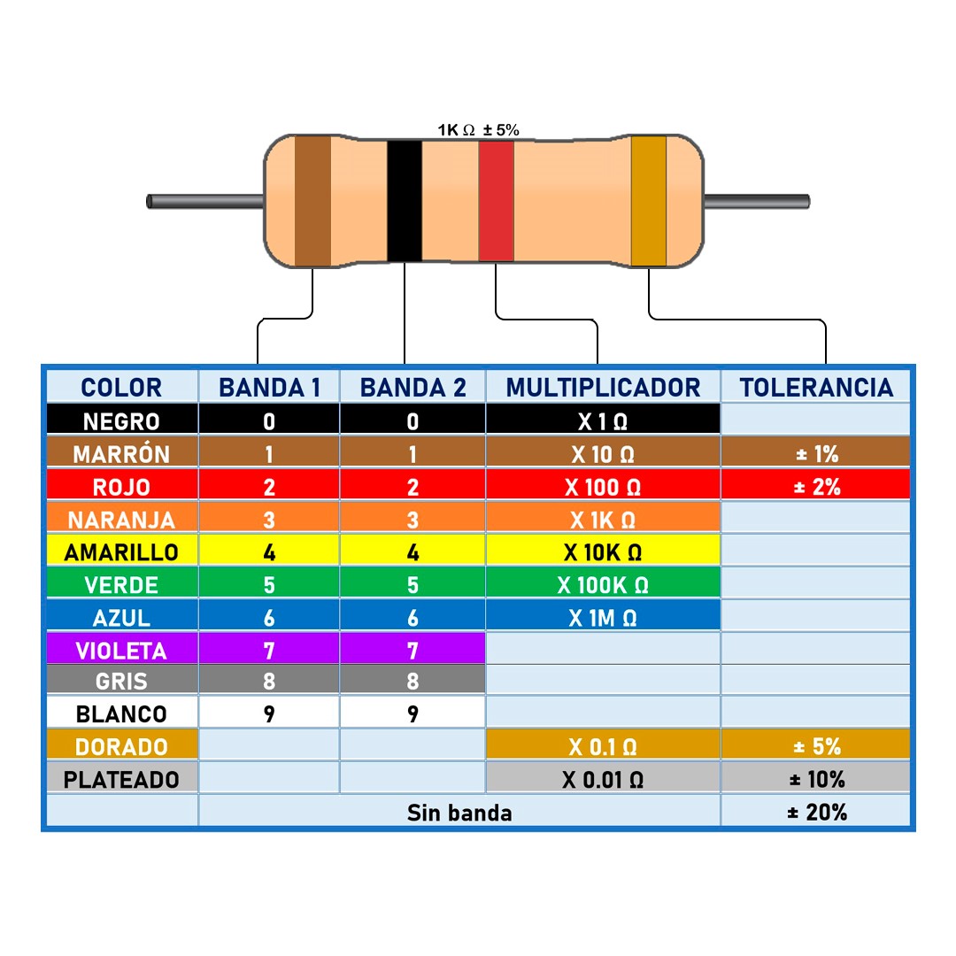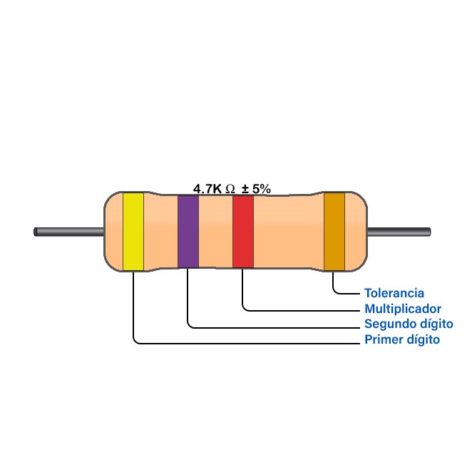Las primeras dos bandas indican el valor significativo de resistencia, donde podemos obtener un valor desde 0 hasta 99. La tercera banda indica el valor a multiplicar los dígitos anteriores, va desde 0.01 Ohmios hasta 1 Mega Ohmio.