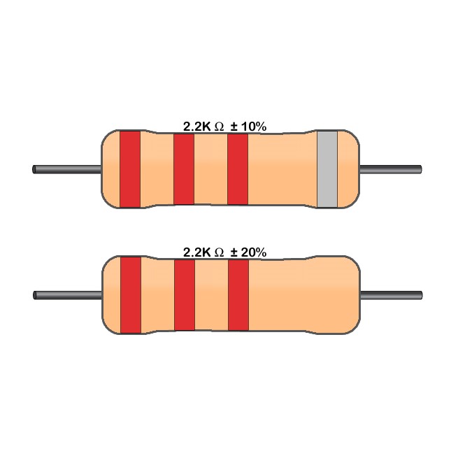 Por último, la cuarta banda indica la tolerancia del valor obtenido de resistencia, físicamente debido a los materiales puede cambiar dicho valor más o menos según indique el color de esta banda. En caso de no encontrar esta banda, la tolerancia sería de un 20%.