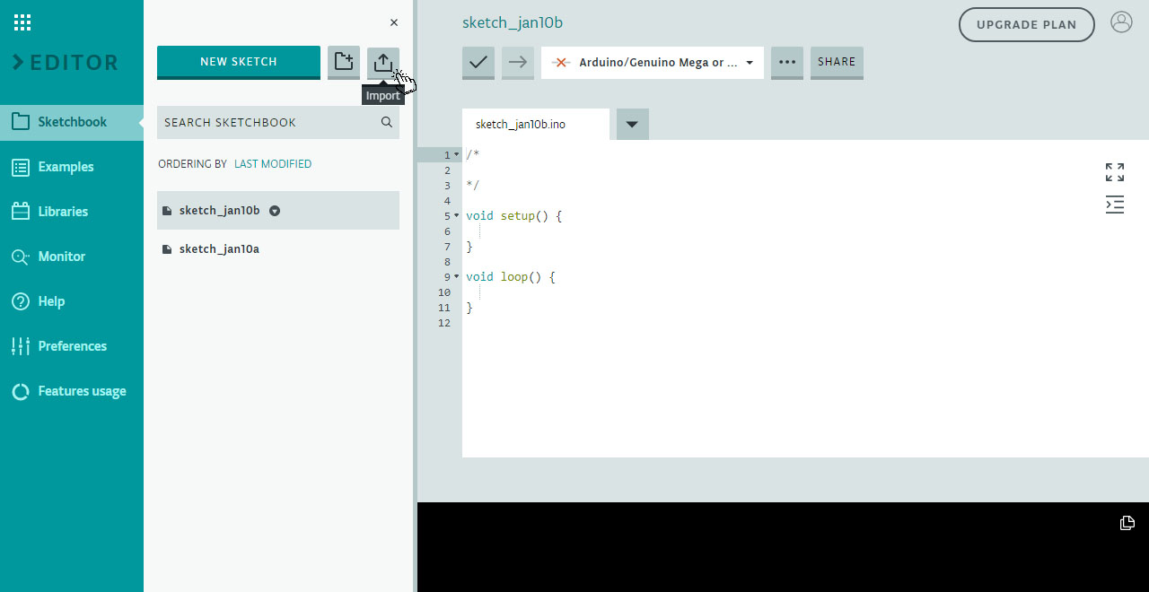 7: Podemos cargar programaciones o librerías al editor web, teniendo presente que en la versión gratis solo tenemos 100 Mb disponibles y con limitación de 100 Sketches.