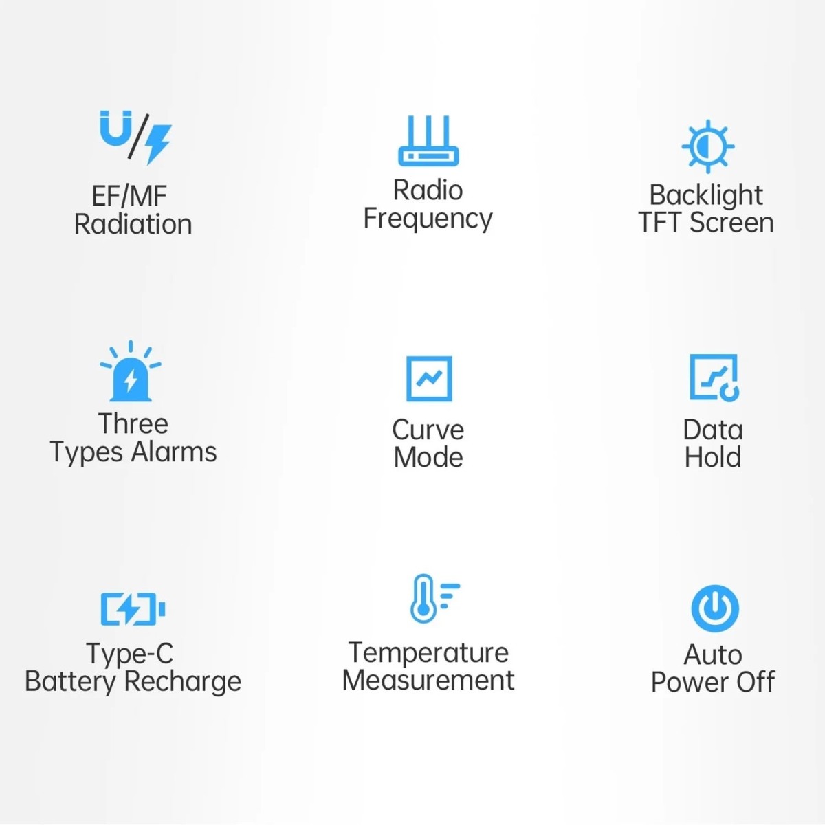 El detector de radiación electromagnética Fnirsi ERD-10 es un instrumento profesional portátil diseñado para medir con precisión la intensidad de los campos eléctricos y magnéticos, así como la potencia de radiación de radiofrecuencia en el entorno. Su característica más destacable es su pantalla a color de alta resolución de 2.4 pulgadas, que no solo muestra los parámetros en tiempo real, sino que también cuenta con un modo de visualización de curvas (gráficos) que se actualiza cada medio segundo, permitiendo un análisis visual inmediato de las fluctuaciones de radiación. Este equipo es versátil e indispensable para evaluar la seguridad electromagnética en hogares, oficinas, interiores de vehículos y espacios al aire libre.