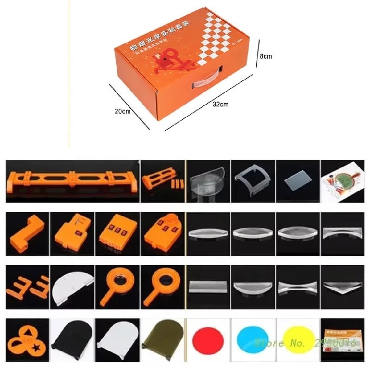 Este es un kit de física diseñado para la realización de experimentos básicos en el campo de la óptica geométrica. Se trata de un conjunto educativo de nivel introductorio, enfocado en proporcionar las herramientas esenciales para que los estudiantes puedan explorar y comprender los principios fundamentales de la luz, como la formación de imágenes, la reflexión y la refracción. Todos los componentes vienen organizados en una caja de cartón con asa para facilitar su almacenamiento.