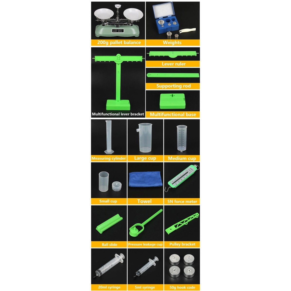 - Equipo para máquinas simples: Soporte de palanca multifuncional, regla de palanca, 2 poleas dobles, 2 poleas simples
