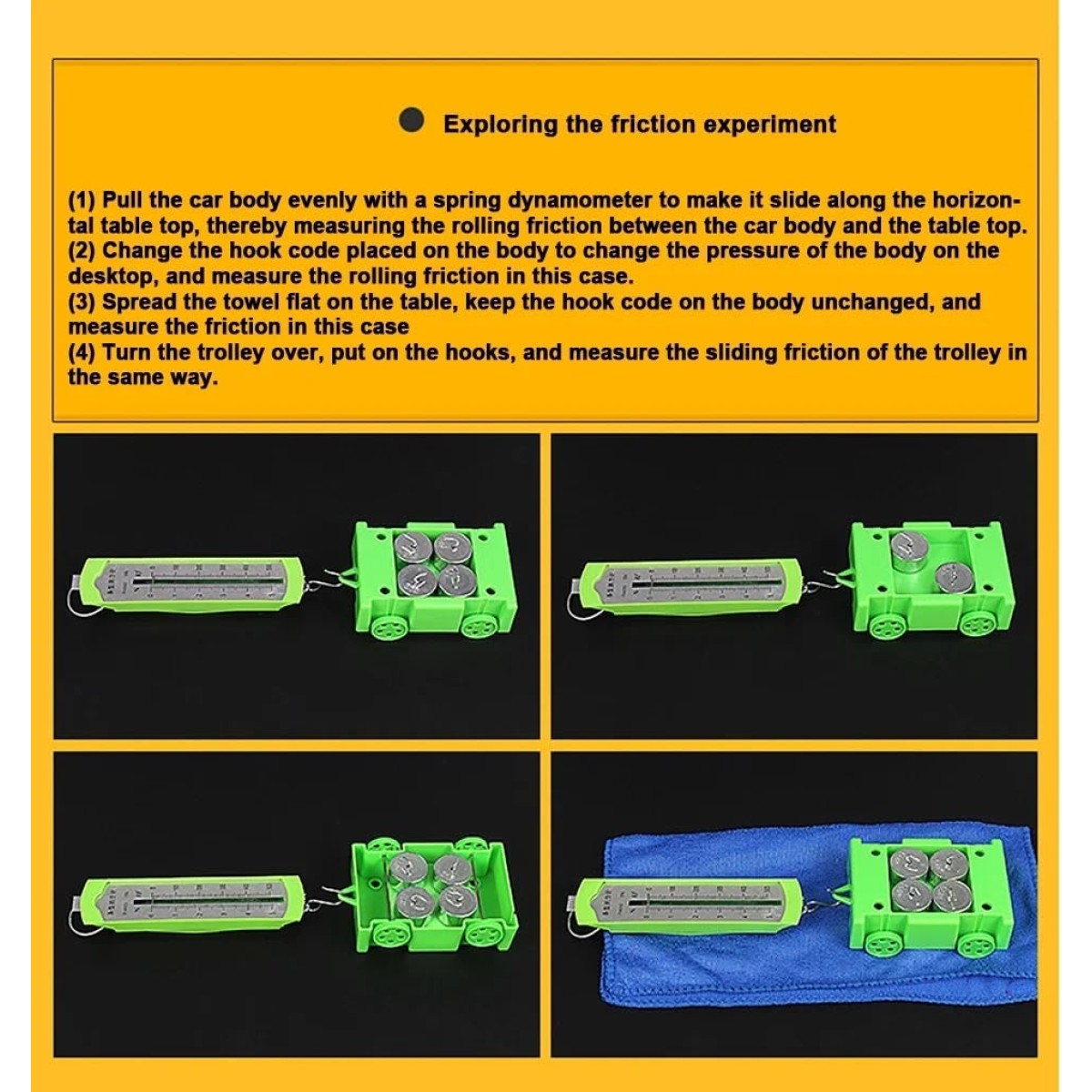 - Material de experimentación: 4 pesas de gancho de 50g, carrito, bloque de esponja, bolas de acero y cristal