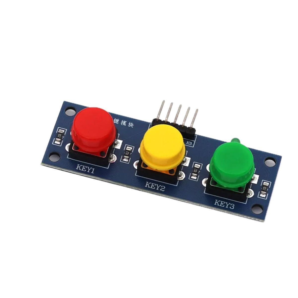 Este producto es un módulo de entrada que integra tres botones pulsadores de gran tamaño y colores distintivos (rojo, amarillo y verde) en una sola placa de circuito impreso. Está diseñado para ofrecer una interfaz de usuario simple, visualmente clara y fácil de operar en proyectos de electrónica y microcontroladores. Su formato "3 en 1" simplifica la conexión y el montaje, proporcionando una solución ordenada para añadir controles a un dispositivo.