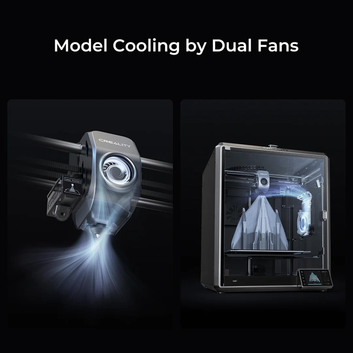 - Enfriamiento eficiente del modelo: Un gran ventilador en el cabezal de impresión con conductos de aire enfría directamente el modelo, mientras que un ventilador auxiliar de 18W en la cámara de construcción mejora el efecto de enfriamiento, permitiendo que el modelo se solidifique antes de que ocurran problemas como hilos o deformaciones.