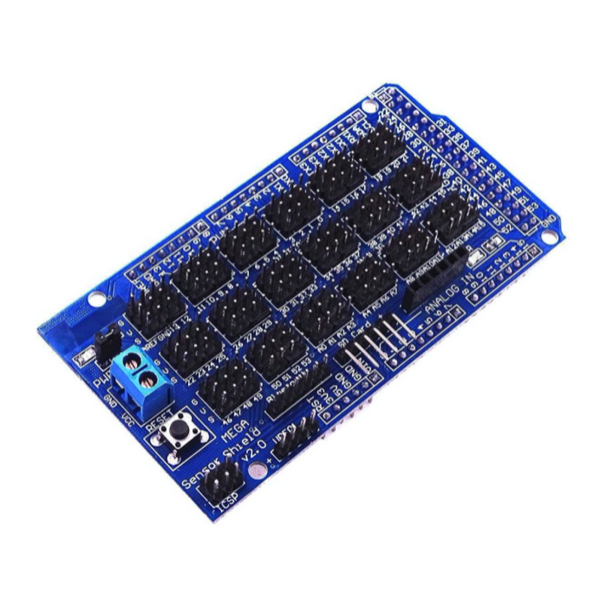 El Arduino Sensor Shield V2.0 permite la conección directa a una placa Arduino Mega y facilitar la conexión de diferentes módulos, como sensores, relés, servos, botones, potenciómetros y más.